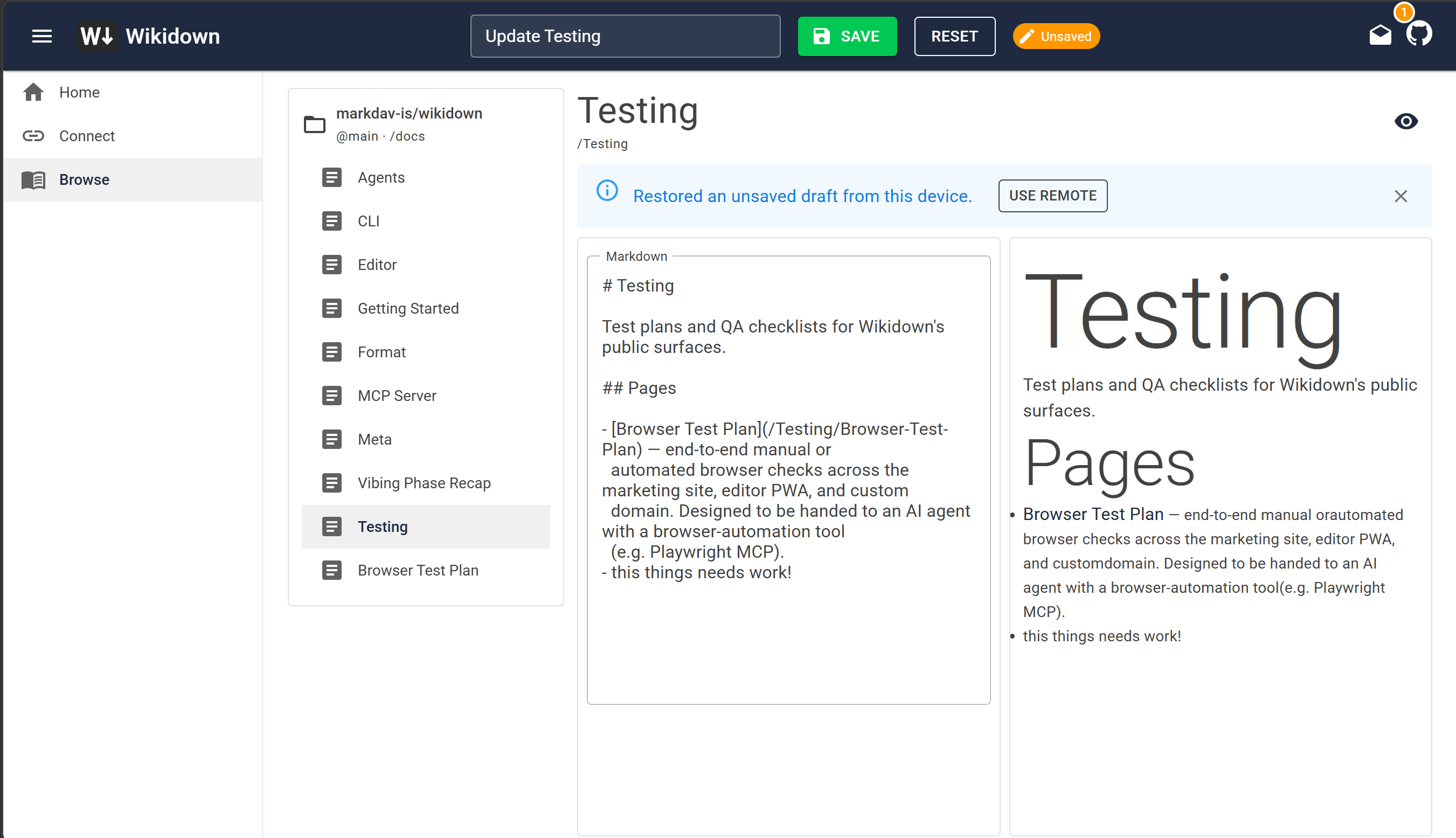 The wiki eats its own dogfood. The Wikidown repository’s own /docs folder is a Wikidown wiki, edited through the CLI and the MCP server. That is the only honest way to know if the thing works.