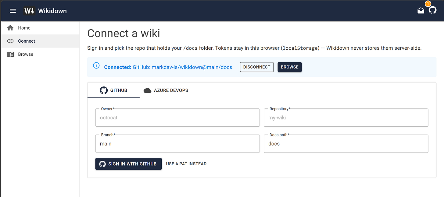 Visit the Wikidown.app Connect page. Sign in with GitHub, pick a repo, and go.